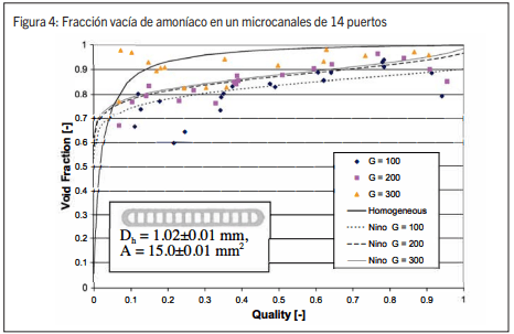 Aumentar la fracción vacía requiere una comprensión detallada del tema. Aunque la fracción vacía ha sido estudiada en profundidad (véase Zivi [ 14 ], Butterworth [5], Newell [ l O], etc.), hasta donde sabemos no hay datos sobre el amoníaco en microcanales, salvo las publicaciones de Litch y Hrnjak [9] y Adams, Hrnjak y Newell [ l ]. Normalmente, un determinado fluido y título de vapor local, podría lograrse cierta reducción de la carga (aumento de la fracción vacía) aumentando el flujo de masa o de calor, afectando al régimen del flujo, tal y como se debate en [22].