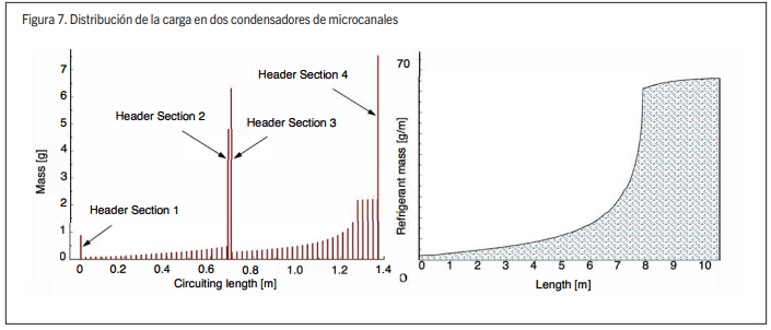 Se tomaron mediciones de la carga de refrigerante del condensador en diferentes condiciones de funcionamiento. Las mediciones de carga se comparan con los resultados calculados utilizando diferentes modelos de la fracción vacía. Todas las correlaciones de la fracción vacía arrojan una predicción similar de la carga total. La correlación de Newell (Newell et al. [1 0]) para el condensador en serpentín es la que tiene el menor error medio de 9.3 por ciento, con un máximo del 15,7 por ciento. Con las correlaciones de Butterworth [5] y Zivi [ 14], los errores medio y máximo son 10,1 / 22,8 por ciento y 12,3 / 24,9 por ciento, respectivamente. El ligero exceso de la predicción se explica por una sección subenfriada calculada que es mayor que la real, sobrestimando así la carga. Los datos de Adams, Hrnjak y Newell [1] se ajustan bien a la predicción. Estos resultados se presentan en la figura 6. Evidentemente, las predicciones para un condensador en serpentín son mucho más precisas que para el microcanales cuando se utiliza la misma correlación y los mismos datos experimentales. Esto se explica por una importante imprecisión de la predicción de la carga en los colectores (véase la figura 7). Otra conclusión de la figura 7 (condensador en serpentín) es que el subenfriamiento del líquido contribuye en gran medida a la carga total. El reparto de la carga estimado en las distintas zonas del condensador, para el caso de cálculo de mayor subenfriamiento de líquido, es del 0,5% en la zona de recalentamiento, del 29,2% en la zona de cambio de fase y del 70,3% en la zona de subenfriamiento. Para el caso de cálculo con el menor subenfriamiento líquido, el reparto es del 0,5 por ciento, del 60.1 por ciento y del 39,4 por ciento en el subenfriamiento. Aunque la zona de subenfriamiento es sólo el 26 por ciento de la longitud total del tubo, esta contiene el 70 por ciento de la carga total. Por lo tanto, es interesante reducir el subenfriamiento no sólo para aumentar la transferencia de calor, sino para reducir la carga de refrigerante.