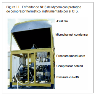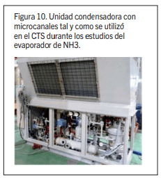 La figura 10 muestra una foto de una unidad de condensación con un intercambiador de calor de microcanales utilizada en una instalación experimental para la evaluación de evaporadores de amoníaco, mientras que la figura 11 muestra una unidad de la figura 9, CTS instrumentado para la implementación de condensadores de microcanaesl.